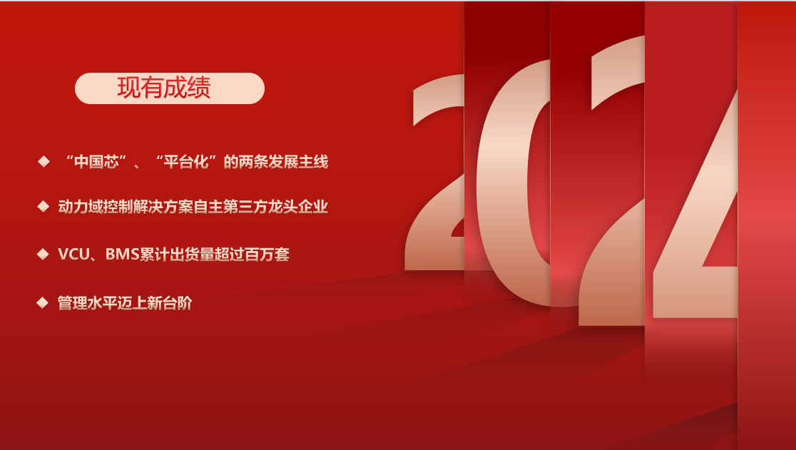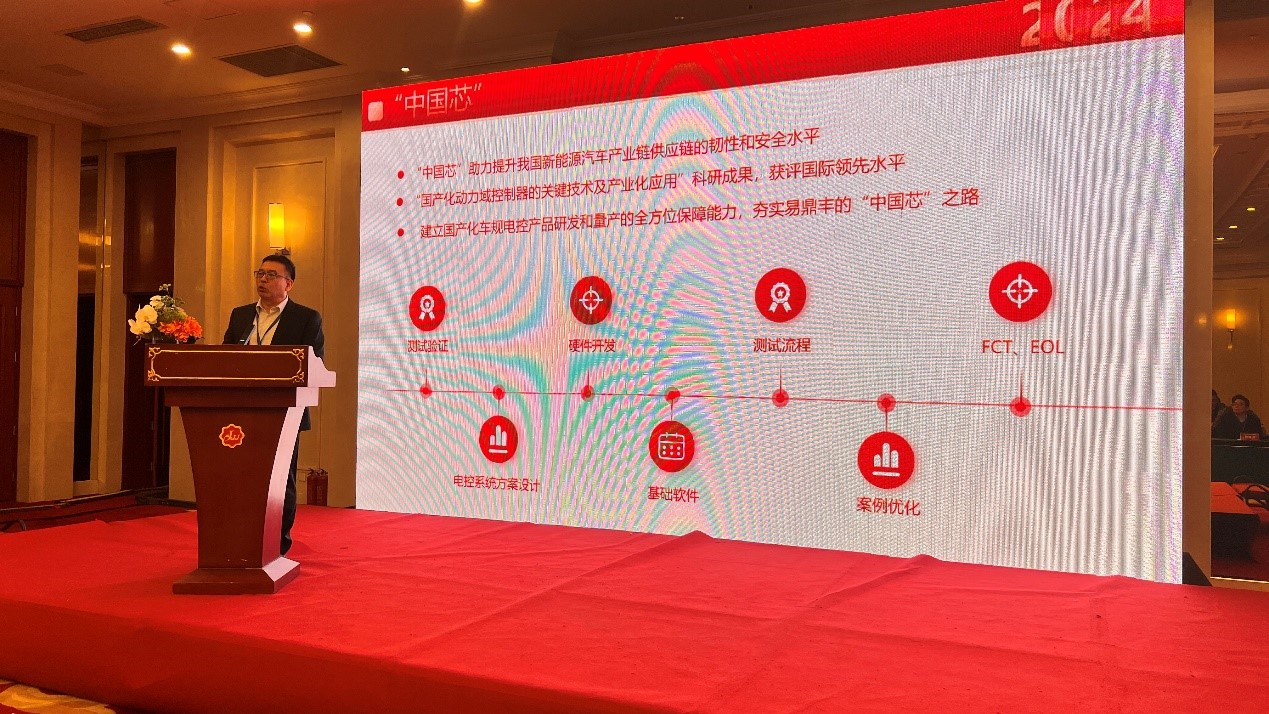 “易鼎丰”深耕“国芯”、韧性成长,“国产化动力域控制器的关键技术及产业化应用”科研成果,获评国际领先水平。在国产化芯片车规应用开发中,“易鼎丰”从芯片的测试验证,电控系统方案设计,硬件开发、基础软件、测试流程及案例优化到生产质量控制中的FCT、EOL,建立了国产化车规电控产品研发和量产的全方位保障能力。与今天到会的国产化芯片车规应用的先行者们深度合作,夯实了易鼎丰的“中国芯”之路。下一步将围绕构建汽车产业