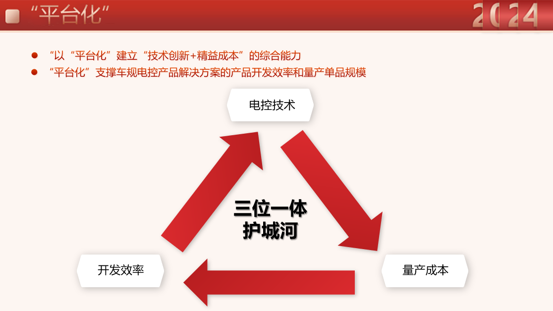 经过多年努力,我国新能源汽车产品竞争力大幅提升,2023年,我国新能源汽车产销量占全球比重超过60%,已进入全面市场化拓展期,“卷”、“更卷”已成为行业共识。“更卷”,意味着行业从整车到产业链各个环节的重新洗牌。在产业变革时期,易鼎丰将以“平台化”建立“技术创新+精益成本”的综合能力,提升车规电控产品解决方案的产品开发效率和量产单品规模,建立“易鼎丰”的电控技术、开发效率和量产成本三位一体的护城河。