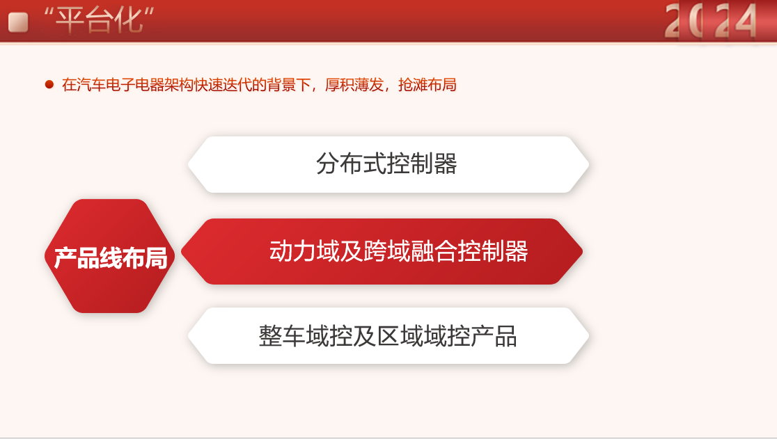 在汽车电子电器架构快速迭代的背景下,“易鼎丰”厚积薄发,积极抢滩布局,拥有了丰富的产品线:分布式控制器VCU、BMS、VBU、TMM、TCU;动力域及跨域融合控制器PDCU、VCUX、XCU,成功配套上汽通用五菱、一汽富奥、中国重汽、一汽红旗、汇川技术、Stellantis和Valeo等国内外众多OEM及Tier1企业。针对中央域控架构,在整车域控VDC、区域域控ZCU也在进行研发布局。