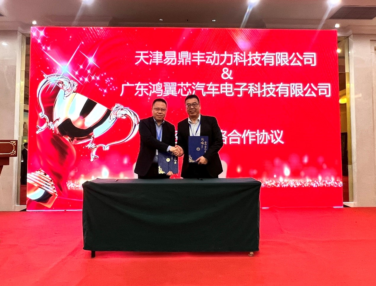 广东鸿翼芯汽车电子科技有限公司签约代表创始人、CEO郑鲲鲲与易鼎丰签约代表董事长、总经理赵春明现场签约。