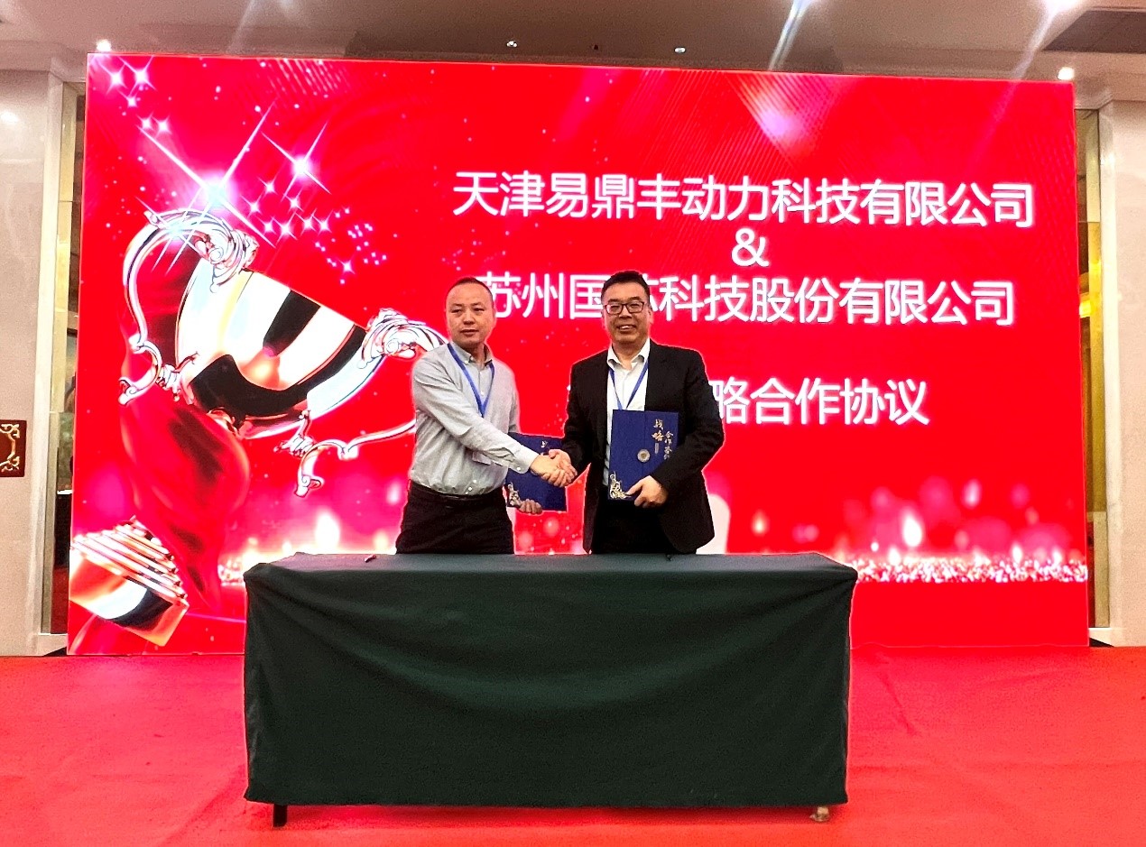 苏州国芯科技股份有限公司的签约代表汽车电子和机器人芯片事业部副总夏超与易鼎丰签约代表董事长、总经理赵春明现场签约。