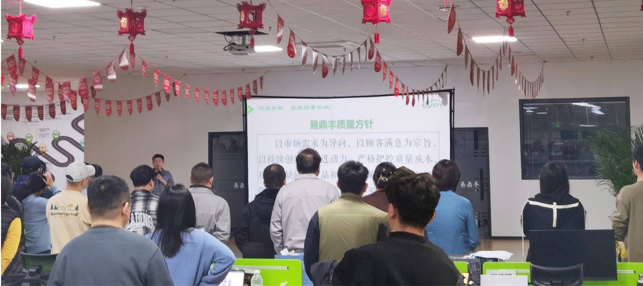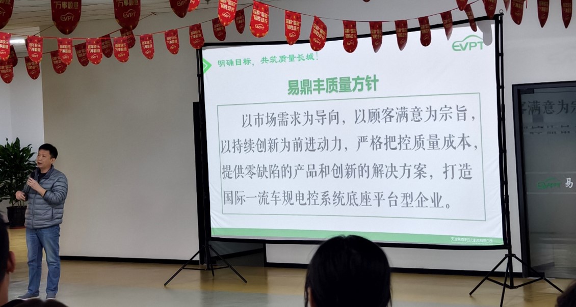 其次,发布会明确了本次内部审核的目的——全面评估IATF16949质量管理体系的充分性、适宜性和有效性。并宣贯了易鼎丰的质量方针:以市场需求为导向,以顾客满意为宗旨,以持续创新为前进动力,严格把控质量成本,提供零缺陷的产品和创新的解决方案,打造国际一流车规电控系统底座平台型企业。质量方针是易鼎丰质量管理工作的思想基础,也是全体员工共同遵循的行动指南。